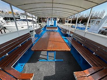 - Закрываемая тентом кормовая часть с длинными лавками и столами.