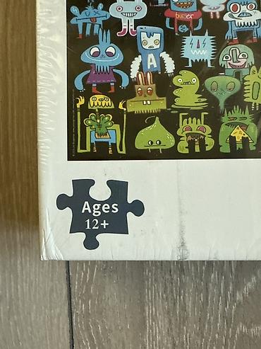 - Иллюстрация: яркая черная подложка с сотнями разноцветных персонажей‑монстров и роботов, множество мелких деталей для интересной сборки.