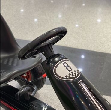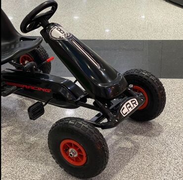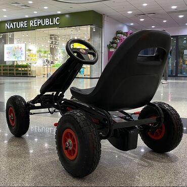 Черный педальный картинг с четырьмя большими колесами и красными дисками. Сиденье эргономичной формы обеспечивает удобную посадку. Рулевое управление позволяет легко маневрировать. Подходит для акт...