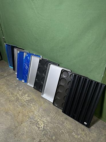 Подбор по размерам и типам по фото: перфорированные голубые/черные листы, гладкие серебристые, формы на 4 продольных канала для багетов, листы с круглыми гнездами под порционные изделия.