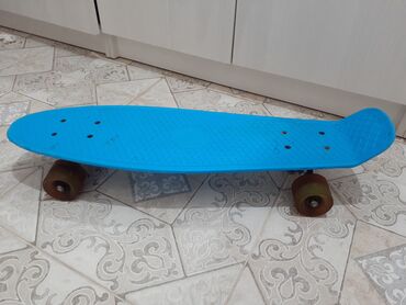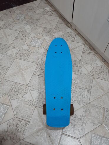 - Дека: компактная, пластиковая, голубая, с противоскользящим ромбовидным рисунком; закруглённый нос и приподнятый тейл для удобного контроля и поворотов.