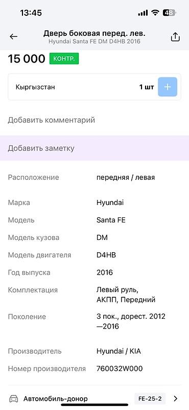 Передняя левая дверь для автомобиля Hyundai Santa Fe, модель кузова DM, 2016 года выпуска. Дверь серебристого цвета, оснащена ручкой и внутренней обшивкой. Подходит для автомобилей с двигателем D4HB, левым рулем и АКПП, переднеприводных. Это дорестайлинговая версия третьего поколения Santa Fe, выпускавшегося с 2012 по 2016 год.