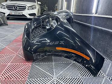 - Комплектация по фото: центральная решётка-«ноздри» с хромированными вертикальными ламелями, нижняя решётка, боковые воздуховоды, площадка под номер, отражатели/габаритные оранжевые вставки по бокам.