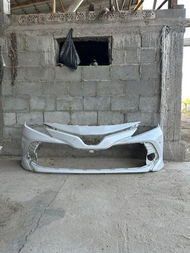 - Бампер Toyota Camry (белый): фирменная V-образная линия под эмблему, места под противотуманные фары/воздуховоды, нижняя губа с клипсами крепления.