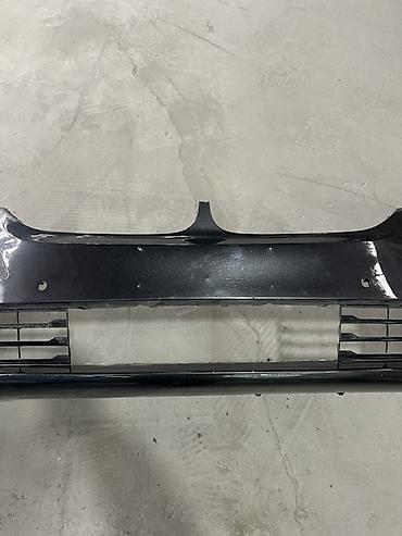 Автомобильный бампер темно-серого цвета, изготовленный из прочного пластика. Предназначен для установки на переднюю часть автомобиля, имеет вырезы для датчиков или противотуманных фар. Подходит для...