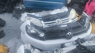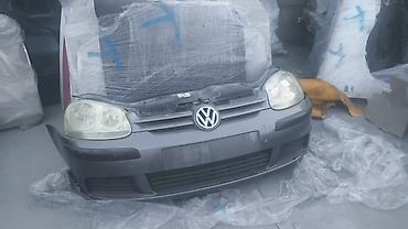 Передний бампер Volkswagen Golf 5 поколения, серого цвета, с фарами. Подходит для замены поврежденных деталей или обновления внешнего вида автомобиля.
