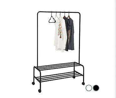 **Металлическая напольная вешалка для одежды** ✨ **Описание:** Удобная и стильная напольная вешалка с двумя перекладинами для одежды, нижней полкой для обуви и боковыми крючками для аксессуаро...