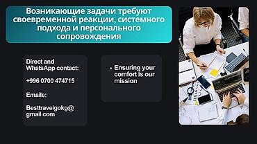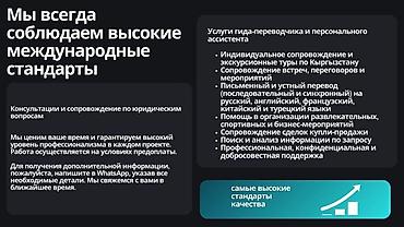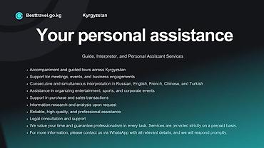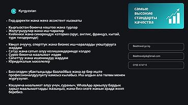 Предлагаю широкий спектр услуг в области сопровождения, туризма, переводов и организации мероприятий в Кыргызстане. Моя команда и я готовы предоставить профессиональную поддержку в следующих областях: