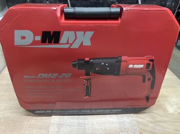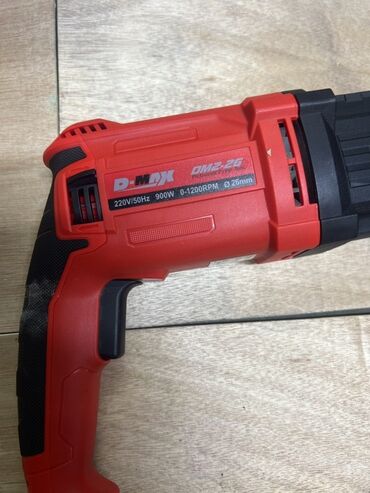 Перфоратор D-MAX DM2-26 красного цвета с черными элементами. Инструмент оснащен тремя режимами работы, что позволяет выполнять различные задачи: сверление, ударное сверление и долбление. Мощность 900 Вт и скорость вращения до 1200 об/мин обеспечивают эффективную работу с различными материалами. В комплект входят сменные насадки, включая долото и буры, а также дополнительная рукоятка для удобства использования. Подходит для строительных, ремонтных и монтажных работ.