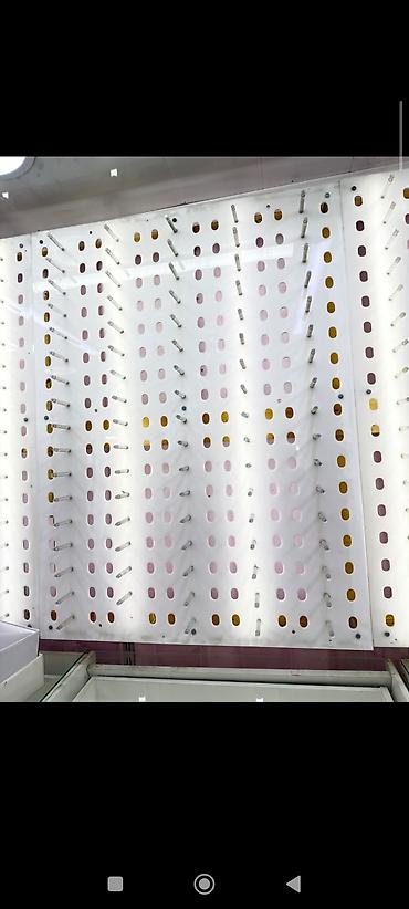 - Вертикальная торговая панель с овальными перфорациями и прозрачными акриловыми штырями-крючками.
