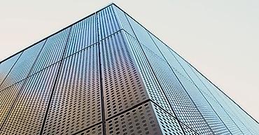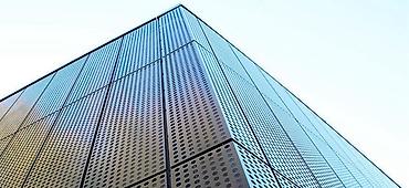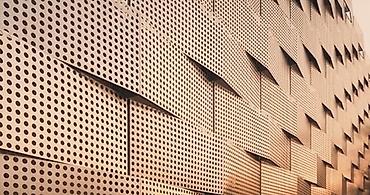 Металлические перфорированные панели для фасада здания. Панели серого цвета с небольшими отверстиями создают современный и функциональный внешний вид. Расположенные под углом, они могут служить для регулирования освещения и создания уникального архитектурного решения. Подходят для облицовки как жилых, так и коммерческих зданий.