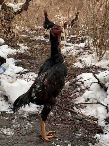 - Молодой петух породы Асиль: высокая стойка, мощная грудь, крепкие жёлтые плюсны, характерный плотный клюв и вытянутая шея.