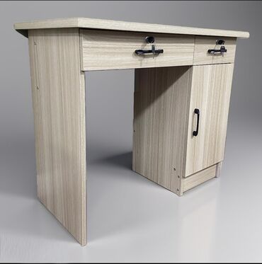 Небольшой письменный стол из ламинированного ДСП с двумя выдвижными ящиками и тумбой с дверцей. Столешница имеет слегка выступающие края. Один из отсеков стола открытый, что позволяет разместить там системный блок компьютера или другие необходимые предметы. Фурнитура выполнена в черном цвете.