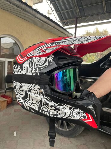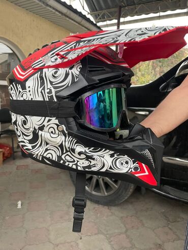 В комплекте показан кроссовый шлем с козырьком и очками (зеркальные линзы), графика черно-белая с красными элементами, регулируемый ремешок с застежкой.