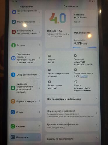 Планшет CCIT Tab T9 (Android) - Дисплей: большой экран с тонкими рамками, фронтальная камера по центру верхней рамки. - Память/хранилище: оперативная память 16 ГБ (в настройках указано «использует...