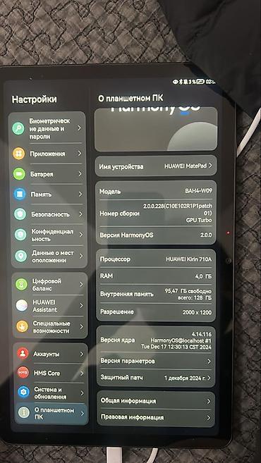 В комплекте на фото — планшет HUAWEI MatePad и фирменная магнитная клавиатура-чехол с русскими буквами. Отлично подходит для учебы, работы с документами и мультимедиа. Скриншот из настроек подтверждает модель и параметры устройства.