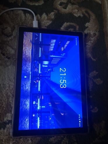 Планшет с чехлом-книжкой - Диагональ экрана около 11" (тонкие рамки, фронтальная камера по центру длинной стороны — удобно для видеосвязи). - Работает, на фото включённый экран с заставкой. - Тыль...