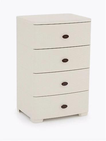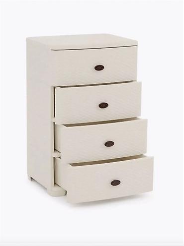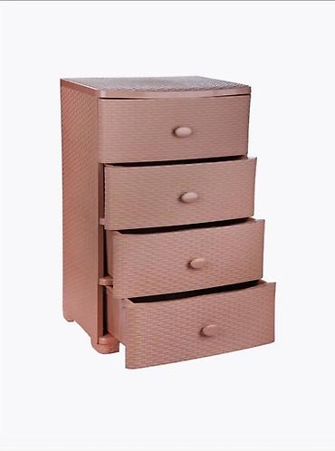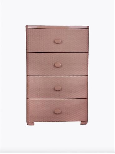 Оригинальный и функциональный комод способен гармонично вписаться в интерьер любой комнаты. Комод произведен из высококачественного и безопасного полипропилена. При производстве используется только сертифицированное и экологически чистое, качественное сырье отечественных и зарубежных производителей. Данное изделие произведено на современном технологичном оборудовании, а потому отличается прочностью и устойчивостью разнообразным механическим воздействиям. Также особую прочность изделию придает цельная конструкция перегородок. Оригинальный внешний вид задает плетеная конструкция на поверхности лицевой части ящика. Комод имеет четыре широких выдвижных ящика большой вместимости, в которых будет очень удобно хранить личные вещи и другие принадлежности. Благодаря небольшому весу, комод очень легко передвигается. Комод упаковывается в индивидуальную упаковку, где каждый клиент сможет найти инструкцию по сборке. Допустимая нагрузка: 4 кг на 1 ящик.