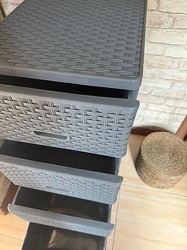 Пластиковый комод серого цвета с четырьмя выдвижными ящиками.