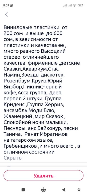 Винила более 3.000 штук от 150 сом также есть аппаратура проигрыватель винила деки катушечные деки кассетные плеера и так далее звоните пишите.