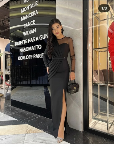 Черное вечернее платье с открытыми плечами и асимметричным низом. - Силуэт: облегающее мини с драпировкой по фигуре, длинные рукава. - Декольте: широкий «лодочка», акцент на плечи и ключицы. - Низ:...