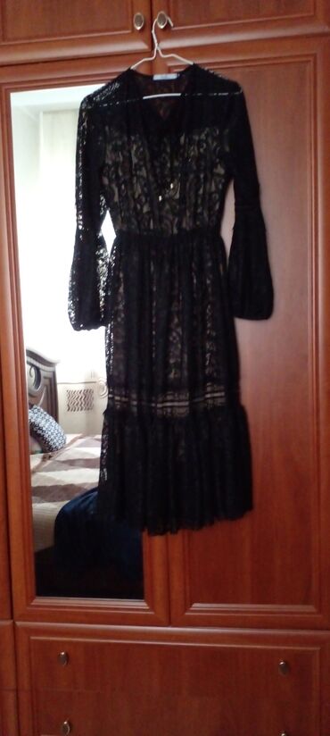 Платье вечернее, миди, серо‑стального оттенка. - Силуэт: приталенный верх и расклешённая юбка миди с мягкими складками. - Лиф: запах с драпировкой, V‑образное декольте, широкие отложные плечевые «...