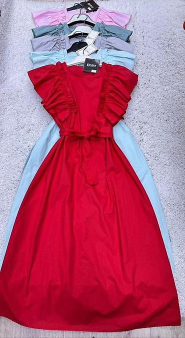 Платье миди из хлопковой дышащей ткани с эффектными воланами на