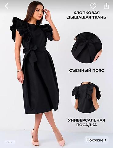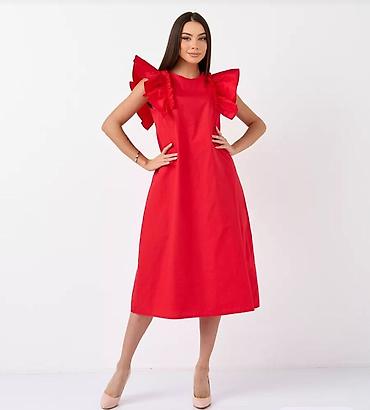 Платье миди из хлопковой дышащей ткани с эффектными воланами на плечах.