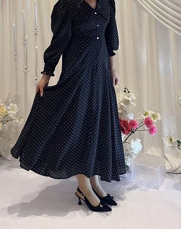 Черное платье в белый горошек - Длина: миди - Фасон: приталенное с расклешенной юбкой - Вырез: квадратный - Рукава: длинные, с легкими объемными плечами - Застежка: скрытая молния сбоку (...