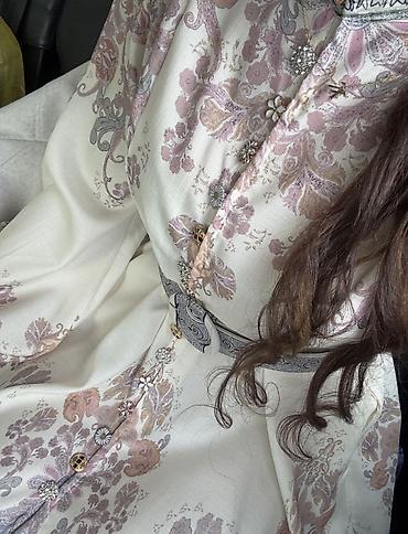 - Принт: изящные растительные и витиеватые узоры в пастельных тонах — розово-лавандовый, бежевый, серый.
