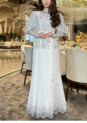 Национальный свадебный комплект невесты в кыргызком этно стиле от известного дизайнера Ванамы. Состав и детали: - Платье цвета вйвори с пышной юбкой и легкой многослойной фатиновой накидкой/шлейф...
