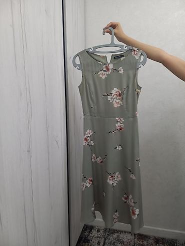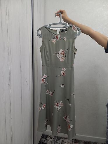 Платье Pompa, миди, без рукавов. Цвет — мягкий оливково‑серый с нежным цветочным принтом (розово‑белые бутоны и веточки). Прямой верх с круглым вырезом, аккуратные вытачки по лифу, талия подчеркнута швом, юбка расклёшенная со слегка асимметричным низом. Лёгкая струящаяся ткань с приятным сатиновым блеском, хорошо держит форму и красиво драпируется. Застёжка — потайная молния на спинке. Подходит для тёплой погоды, торжеств и повседневных образов: гармонирует с босоножками, лодочками и легкими кардиганами. Универсальная, женственная модель, создающая изящный силуэт.