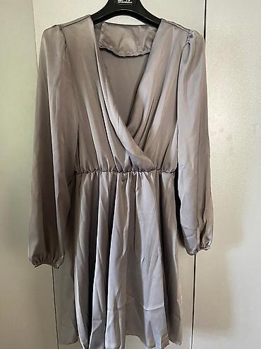 Платье серебристого цвета отлично смотрится ,с длинным рукавом на запах , отлично будет с ремнем . Ткань не мнется и не садиться