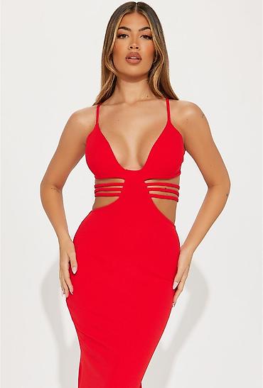 Эффектное красное платье Размер 46 M -Силуэт: приталенное, подчеркивает талию, расклёшенный асимметричный низ с рюшами. - Длина: миди–макси с разрезом по одной стороне. - Бретели: тонкие на завяз...