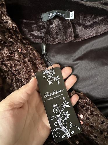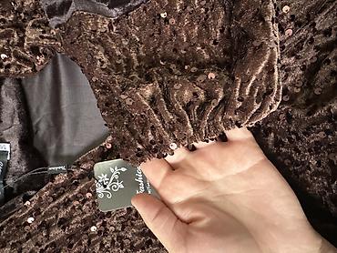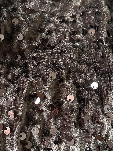 Платье женское нарядное, коричневое, миди. Верх и часть юбки украшены пайетками, вторая часть выполнена из бархатной ткани, создавая эффект асимметрии. V‑образный запах на лифе, рукава 3/4 с легкой сборкой у манжет. В комплекте ремень с круглой пряжкой, подчеркивающий талию. Идеально для торжеств и вечерних выходов, комфортно садится и красиво драпируется.