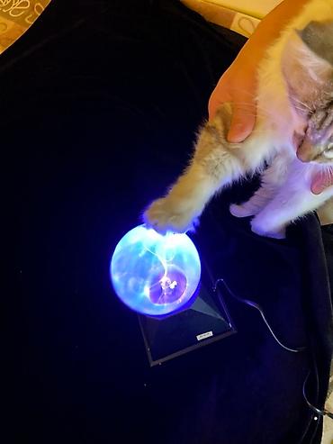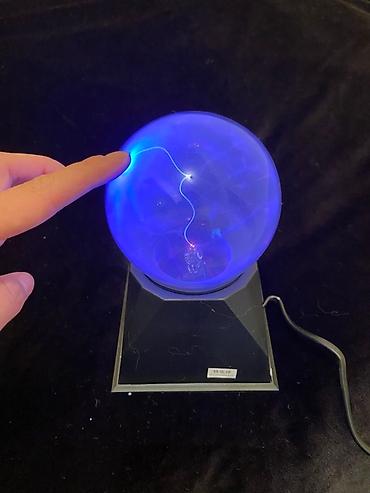 - Эффектные разряды внутри стеклянной сферы, которые тянутся к точке касания пальцем.
