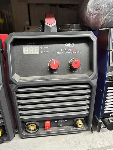 - LGK‑60 Plasma Cutting Machine — регулировка тока и времени продувки, цифровой индикатор тока, индикация Power/Alarm. Разъёмы: Workpiece/масса, Arc Start, Control, Gas/Electrical output.