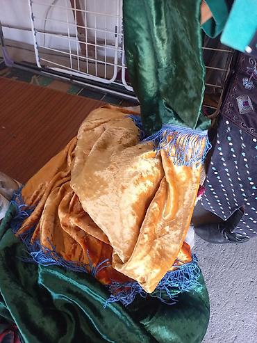 - Плотный бархатный плед/накидка из изумрудно‑зелёного и медово‑золотого бархата, с декоративной бахромой василькового цвета по краям. Мягкая, тяжелая фактура, благородный блеск, подходит как для дивана, кровати или в качестве торжественной накидки/портьеры.
