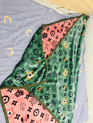 - зеленый с принтами «цветки/короны/LOVE», изнанка — розовая с тем же рисунком;