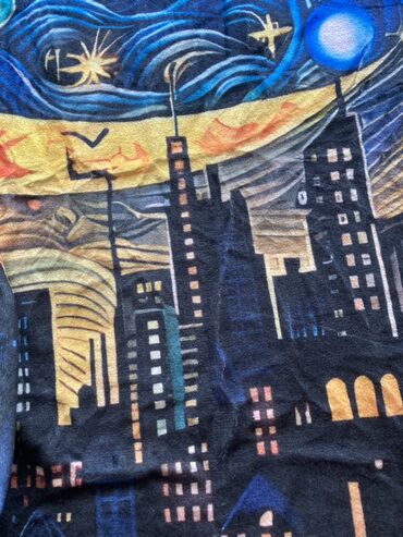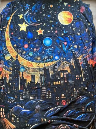 - Яркий печатный дизайн: полумесяц, звёзды, планеты, ночное небо и силуэты небоскрёбов. Глубокие синие и чёрные оттенки с жёлто‑оранжевыми акцентами.