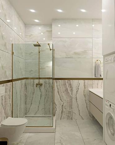 Керамическая плитка и керамогранит с имитацией мрамора и камня. - Форматы: крупные плиты для стен (примерно панельного формата) и напольные модули квадратной формы. - Дизайны: - Мраморные по...