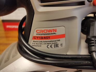 Идеально подходит для шлифования древесины, шпаклевки и лакокрасочных покрытий. Модель: CT13401, серия Crown Professional. Производитель/бренд указан на шильдике: Merit Link International AG, CH‑6855 Stabio, Switzerland,