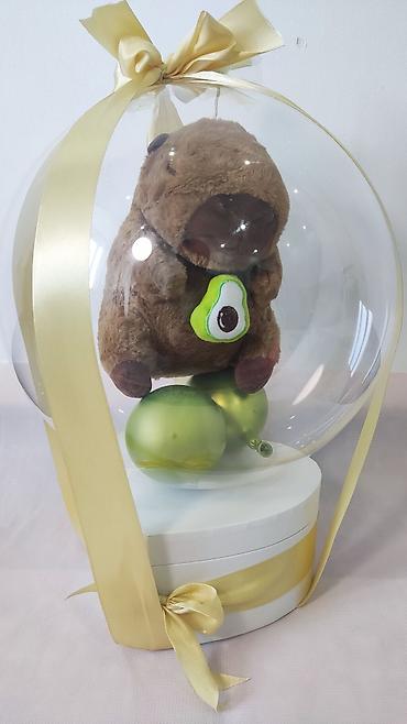 - Внутри — плюшевая игрушка (варианты на фото: белый мишка, бежевый зверёк, коричневый «авокадо-медвежонок»).