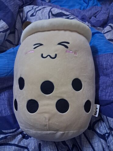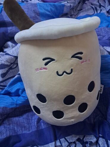 - Большая плюшевая подушка в форме стакана боба‑чая с милой вышитой мордочкой и «жемчужинами»‑кружочками.