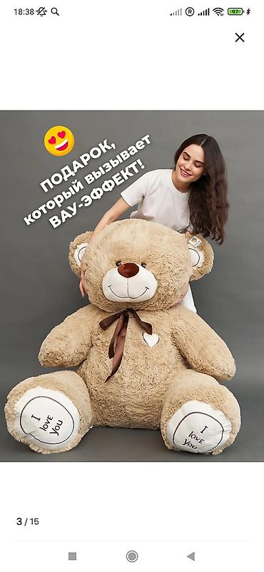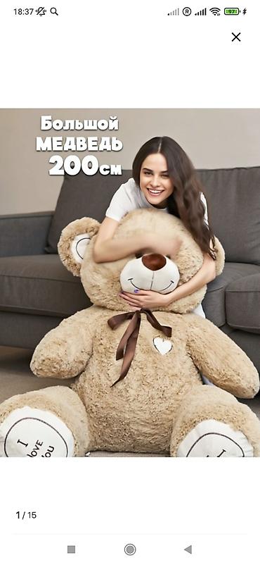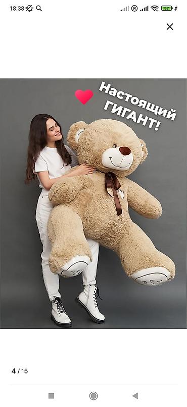 - Огромный мягкий мишка высотой 200 см — вызывает вау‑эффект и дарит объятия «в полный рост».