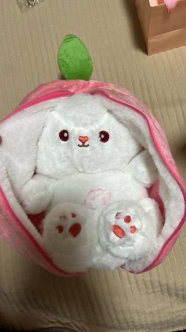 - Плюшевый зайчик в чехле-персике: мягкий белый зайка с вышитыми мордочкой и лапками, помещён в объёмный розовый футляр на молнии с зелёным «листиком». Чехол можно использовать как чехол-игрушку/косметичку/органайзер.