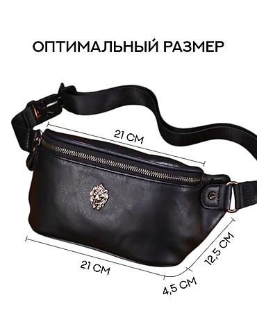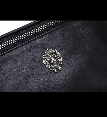 Поясная сумка из натуральной кожи, выполненная в черном цвете. Оснащена регулируемым ремешком для удобной посадки на талии или через плечо. На лицевой стороне расположен центральный карман на молнии, украшенный металлической эмблемой ввиде Льва. Сумка подходит для ношения повседневных мелочей, таких как телефон, ключи и кошелек. Универсальный аксессуар для активного образа жизни.