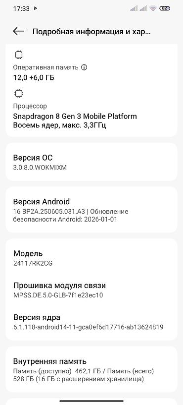 - ОС: Android 16 (версия ядра 6.1.118; прошивка модуля связи MPSS.DE.5.0-GLB-7f1e23ec10; обновление безопасности Android: 2026-01-01).