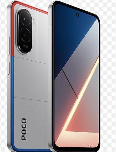 - Дизайн и корпус: плоские грани, металлический оттенок рамки; задняя крышка с текстурированными секциями и крупным логотипом POCO снизу. Блок камер с контрастной красной окантовкой; синяя кайма по периметру спинки.