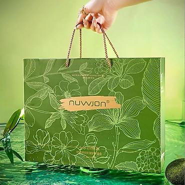 - Фирменная упаковка NUWJON: жесткая коробка с растительным принтом и плотными шнуровыми ручками.